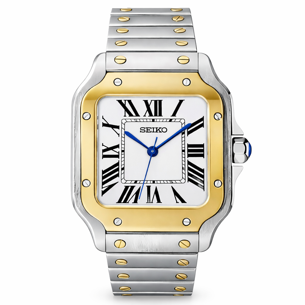 El Santeiko es un elegante reloj de inspiración clásica, fabricado en acero inoxidable con un acabado cepillado y pulido que resalta su diseño cuadrado con tornillos visibles en el bisel y el brazalete. Su esfera blanca presenta números romanos negros y agujas azuladas tipo espada, evocando un estilo refinado y atemporal. En su interior late un movimiento automático Seiko NH35, reconocido por su fiabilidad y precisión. La corona, decorada con una piedra azul, añade un toque distintivo y sofisticado al conjunto. Un reloj que combina tradición, elegancia y solidez mecánica.