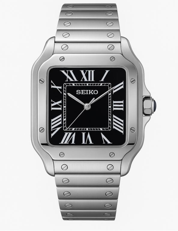 El Santeiko es un elegante reloj de inspiración clásica, fabricado en acero inoxidable con un acabado cepillado y pulido que resalta su diseño cuadrado con tornillos visibles en el bisel y el brazalete. Su esfera blanca presenta números romanos negros y agujas azuladas tipo espada, evocando un estilo refinado y atemporal. En su interior late un movimiento automático Seiko NH35, reconocido por su fiabilidad y precisión. La corona, decorada con una piedra azul, añade un toque distintivo y sofisticado al conjunto. Un reloj que combina tradición, elegancia y solidez mecánica.